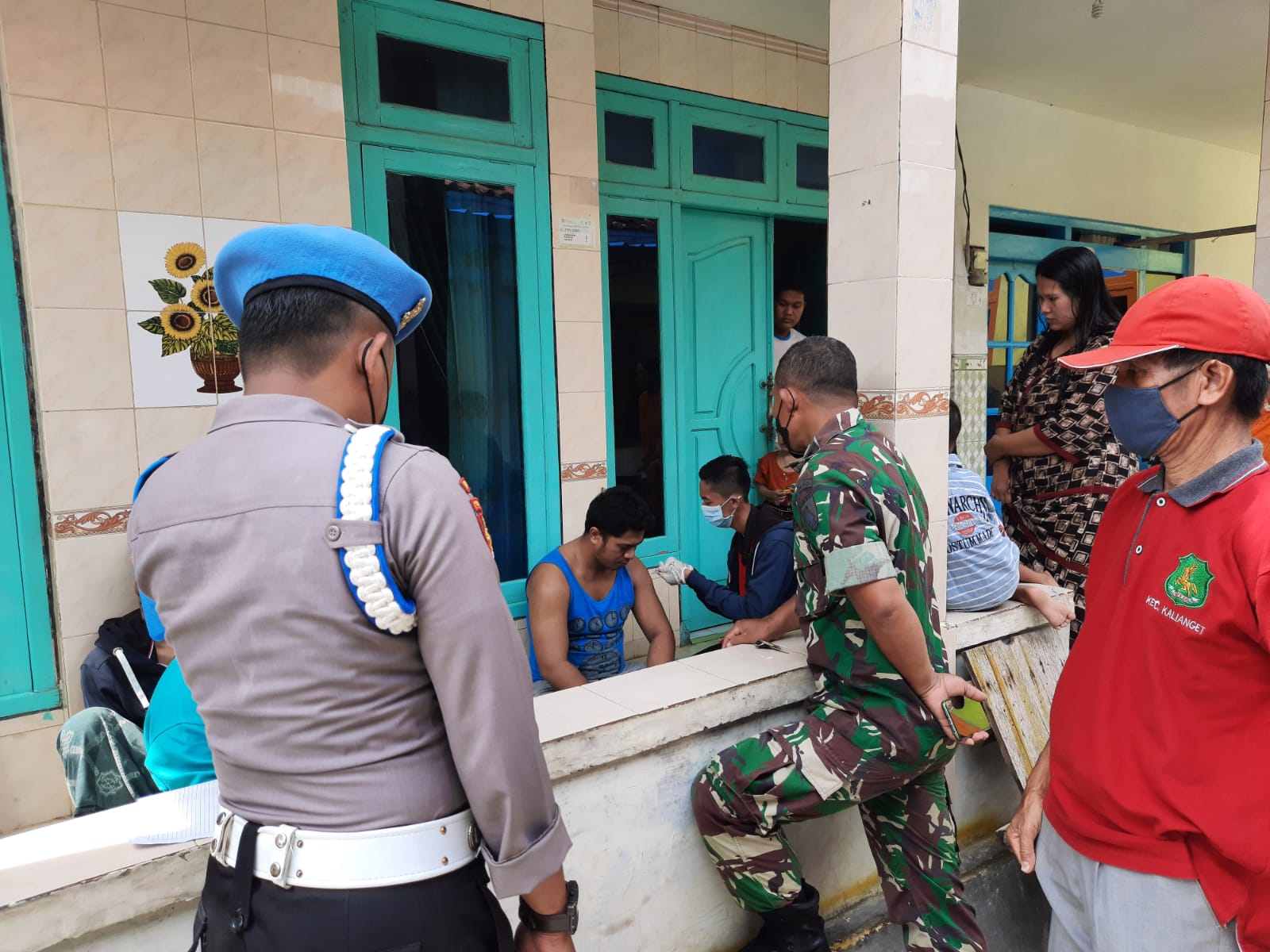 Servis Gerai Vaksin Presisi TNI-Polri yang dilakukan oleh Forkopimcam Kalianget di rumah warga.